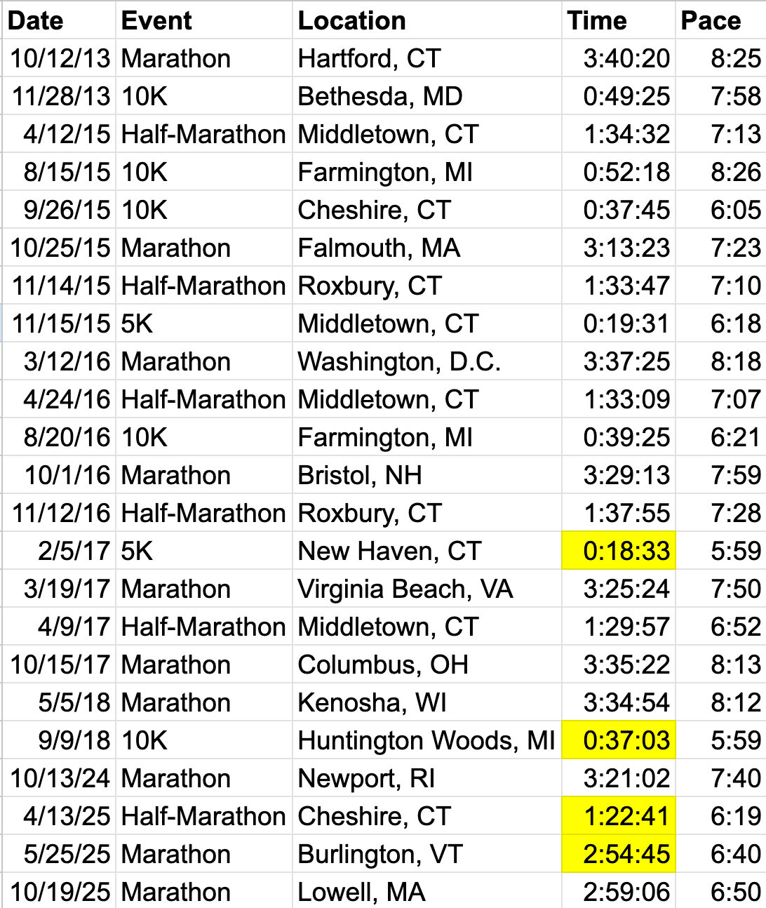 To date, I’ve completed nine marathons. Below is a record of all races I’ve run. Personal records (PRs) are highlighted.